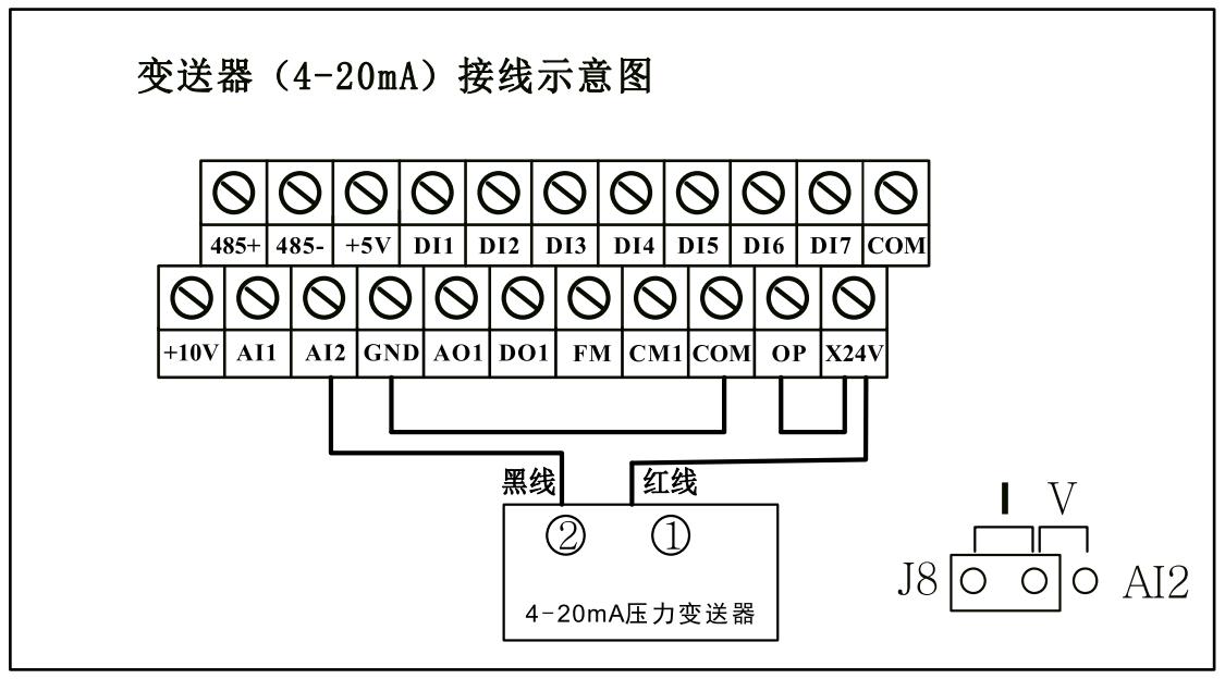 4-20mA變送器反饋模式,需要把綠色端子上的GND和COM用導(dǎo)線短接,變送器的正端接X(jué)24V(或者和X24V短接的OP),信號(hào)線接AI2。如下圖所示。